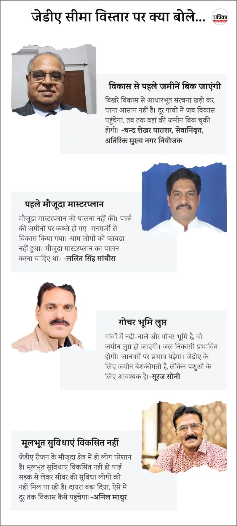 बिखरे विकास से आधारभूत संरचना खड़ी कर पाना आसान नहीं है। दूर गांवों में जब विकास पहुंचेगा, तब तक वहां की जमीन बिक चुकी होगी। सैटेलाइट टाउन पर फोकस करते हुए जेडीए पुराने क्षेत्रफल पर ही फोकस करता तो बेहतर परिणाम सामने आते। जब तक मास्टरप्लान बनेगा, उससे पहले जेडीए से कई तरह की स्वीकृतियां जारी हो जाएंगी। ऐसे में मजबूरन मास्टर डवलपमेंट प्लान में समाहित समायोजन करना पड़ेगा। अचानक बड़ा विस्तार बिना साइंटिफिक स्टडीज के औचित्यपूर्ण नहीं है।