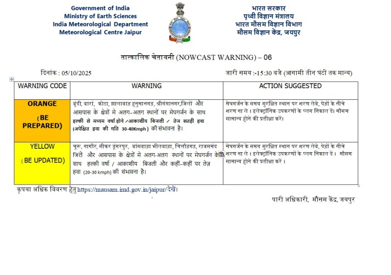 मौसम विभाग ने पांच अक्टूबर को शाम चार बजे जारी चेतावनी में अगले तीन घंटे के भीतर बूंदी, बारां, कोटा, झालावाड़, हनुमानगढ़ और श्रीगंगानगर जिलों में मेघगर्जन, हल्की से मध्यम बारिश और आकाशीय बिजली गिरने की संभावना जताई। इसके साथ ही 30 से 40 किलोमीटर प्रति घंटे की रफ्तार से तेज हवाएं चलने की चेतावनी भी दी गई है। वहीं चूरू, नागौर, सीकर, डूंगरपुर, बांसवाड़ा, भीलवाड़ा, चित्तौड़गढ़ और राजसमंद जिलों में भी अलग-अलग स्थानों पर बारिश होने की संभावना है।