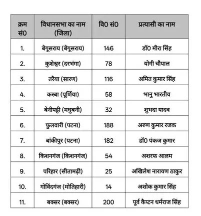 आम आदमी पार्टी ने बिहार के बेगूसराय विधानसभा सीट से मीरा सिंह को उम्मीदवार बनाया है। किशेश्वर (दरभंगा) से योगी चौपाल, तरैया (सारण) से अमित कुमार सिंह, कस्बा (पूर्णिया) से भानु भारतीय और बेनीपट्टी (मधुबनी) से शुभता यादव को उम्मीदवार बनाया है। वहीं, फुलवारी (पटनी) से अरुण कुमार रजक, बांकीपुर (पटना) से पंकज कुमार, किशनगंज से अशरफ आलम, परिहार (सीतामढ़ी) से अखिलेश नरायण ठाकुर, गोविंदगज (मोतिहारी) से अशोक कुमार सिंह और बक्सर से पूर्व कैप्टन धर्मराज सिंह को उम्मीदवार बनाया है।
