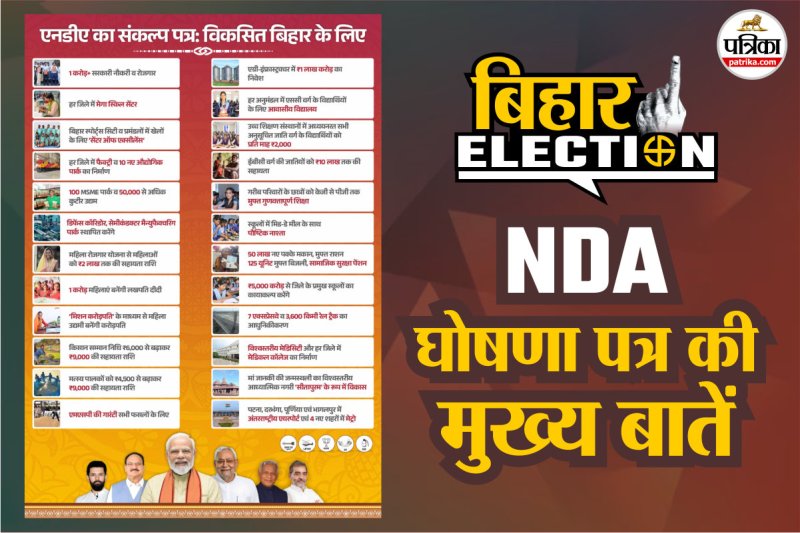 बिहार विधानसभा चुनाव को लेकर NDA ने अपना घोषणापत्र जारी कर दिया। पटना के होटल मौर्या में सुबह 9.30 बजे जॉइंट प्रेस कॉन्फ्रेंस में बीजेपी के राष्ट्रीय अध्यक्ष जेपी नड्डा, मुख्यमंत्री नीतीश कुमार समेत NDA के सभी सीनियर नेताओं की उपस्थिति में इसे जारी किया गया। NDA ने अपने घोषणा पत्र में हर अनुमंडल में कला, वाणिज्य, कानून संकाय का कॉलेज खोलने की भी घोषणा पत्र में चर्चा की गई है।