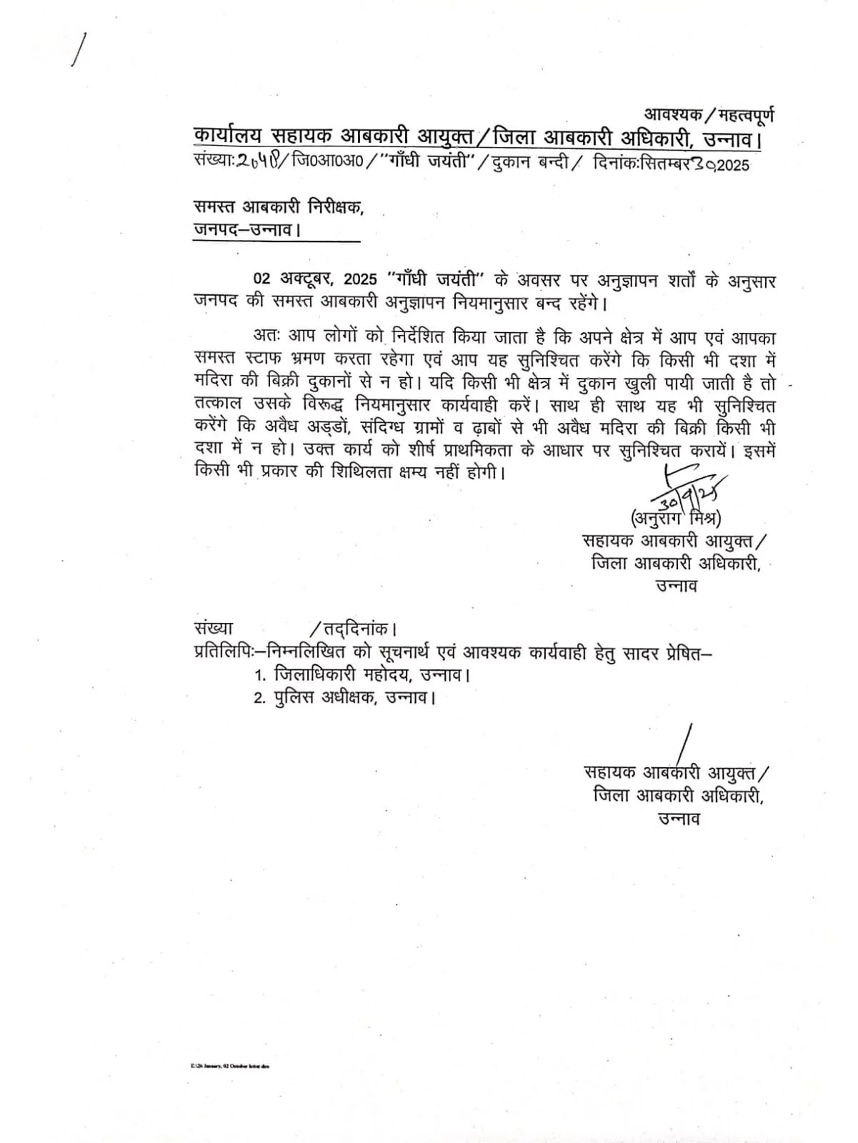 उत्तर प्रदेश के उन्नाव के सहायक आबकारी आयुक्त, जिला आबकारी अधिकारी अनुराग मिश्रा ने बताया कि 2 अक्टूबर गांधी जयंती के अवसर पर जिले में शराब की सभी दुकानें बंद रहेगी। उन्होंने इस संबंध में जिले के सभी आबकारी निरीक्षकों को पत्र जारी किया है। जिसके अनुसार गांधी जयंती के अवसर पर अनुज्ञापन शर्तों के अनुसार सभी आबकारी अनुज्ञापन बंद रहेंगे। आबकारी निरीक्षकों और स्टाफ को क्षेत्र में रहकर भ्रमण करने के निर्देश दिए गए हैं। उन्होंने कहा कि क्षेत्र में रहकर इस बात को सुनिश्चित करेंगे कि किसी भी दशा में अवैध मदिरा की बिक्री न होने पाए। इसके साथ ही दुकानों में भी बिक्री ना हो। यह भी सुनिश्चित करेंगे। यदि दुकान खुली पाई जाती है तो उसके विरुद्ध तत्काल निर्माण अनुसार कानूनी कार्रवाई की जाए।