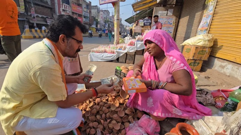 Free distribution of 151000 diyas उन्नाव में 151000 मिट्टी के दीयों का निशुल्क वितरण किया गया। हर घर स्वदेशी, घर-घर स्वदेशी का भी नारा दिया गया। नर सेवा नारायण सेवा की तरफ से विदेशी वस्तुओं और ऑनलाइन शॉपिंग का विरोध किया गया। संस्था के संस्थापक विमल द्विवेदी ने बताया कि इसके खिलाफ पिछले कई वर्षों से अभियान चलाया जा रहा है। स्वदेशी वस्तुओं के उपयोग और स्थानीय व्यापारियों से खरीदारी के प्रति लोगों को जागरूक किया जा रहा है। शहर के गांधीनगर तिराहे से बड़ा चौराहे के बीच सड़क किनारे फुटपाथ पर मिट्टी के दीये बेचने वालों को दीये की कीमत के साथ मिठाई भी दिया गया।